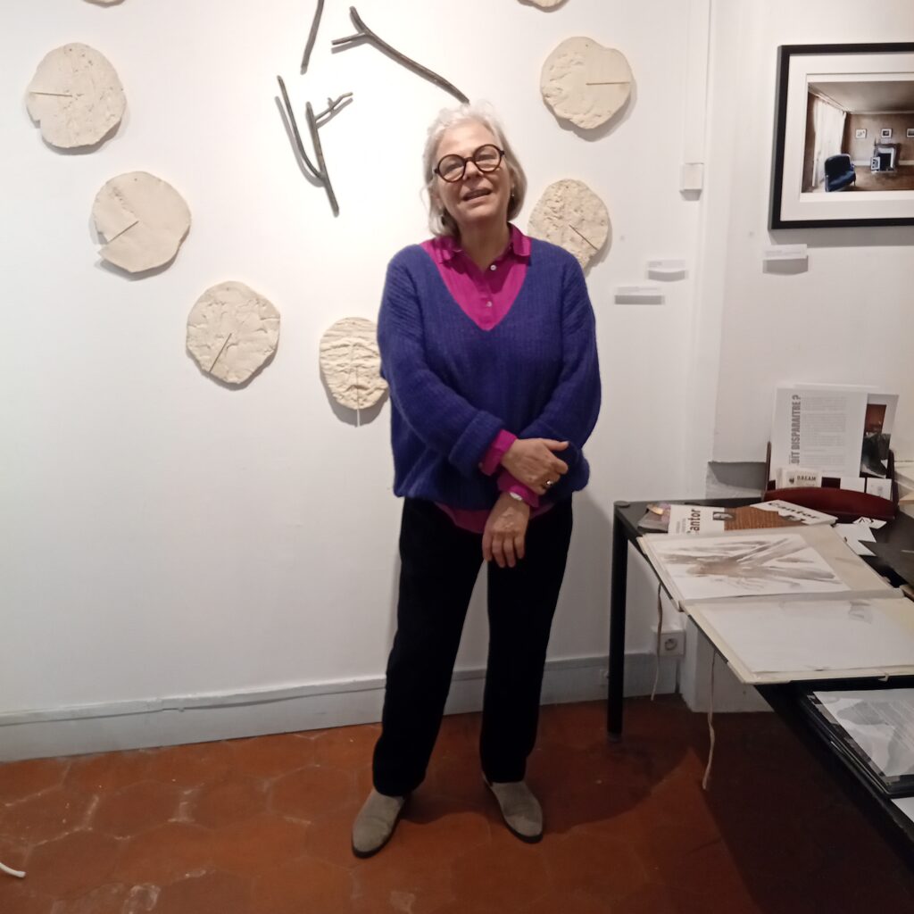 Nathalie Dupuit : Peu de temps avant le montage de l’exposition. Cette installation faisant 1 m 50 de diamètre, s’est posée la question de savoir à quel endroit la fixer… Initialement, j’avais l’intention de d’aligner les empreintes les unes à côté des autres. Ce qui aurait donné autre chose. L’idée de placer au centre les aiguilles en forme de branches – elles-mêmes réalisées en céramique – est venue après. Avec Rosa, nous sommes convenues que c’était un moyen de combler un peu ce vide central, d’évoquer les aiguilles et, ainsi, le temps d’une façon encore plus évidente. Ce fut aussi une façon de souligner la complémentarité de nos œuvres disposées côte à côte : autant je suis dans la matérialité tangible de la céramique, autant, elle, est dans la légèreté que ce soit à travers cette petite peinture d’arbre, qui se prolonge dans des fils débordant le cadre, comme pour en suggérer les racines ; ou de cet assemblage de photos de feuilles de ronces du jardin, développés sur du papier transparent. L’une comme l’autre, nous rendons ainsi hommage, chacune à notre manière, à ce vivant végétal dont nous avons tant besoin, a fortiori dans un centre-ville déjà fortement densifié. Aujourd’hui plus que jamais, nous avons besoin des arbres en particulier, de leur feuillage, pour nous protéger de ces canicules appelées à s’intensifier.